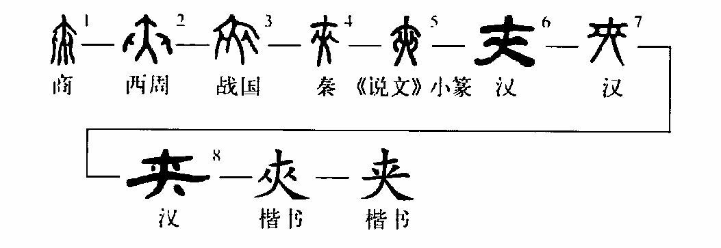 會意字。從大,從二人,從左右二人攙扶中間一人會意。古今字形均作“大”下兩“人”?,F代漢字簡化時,據漢代草書將“夾”簡作“夾”。本義為挾持、從左右相持,讀作jiā。《說文》:“夾,持也。”《儀禮·既夕禮》:“薦馬纓三就,入門,北面,交轡(pèi,韁繩),圉人(養馬之人)夾牽之。”《墨子·雜守》:“守大門者二人,夾門而立。”由挾持引申為扶持、輔佐。也指從兩個相對的方向向內用力,使物體固定不動,引申指夾東西的器具。由從左右扶持義引申為在兩邊的、左右相對的、摻雜等義。“夾”由二人挾持一人引申指里外兩層,如“夾衣”、“夾褲”,這一意義后又作從“衣”、“夾”聲的“裌”及從“衣”、“合”聲的“袷”,讀作jiá,現代漢字整理時,已將“裌”“袷”二字作為“夾”的異體字淘汰。又讀作xié,用作“挾”的通假字;又讀作xiá,用作“狹”的通假字;還讀作gā,用于“夾肢窩”一詞。(郭小武 葉青)