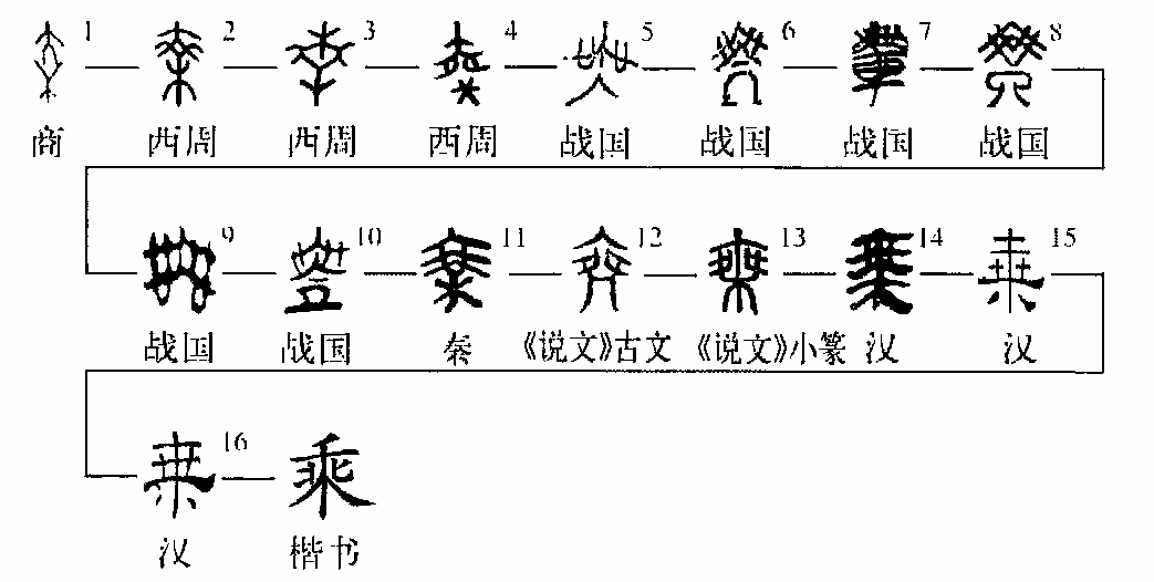 從木。戰國文字訛變更甚,除秦文字從木外,大多已不從木,而改從幾;且多將原標在 “大”下端的兩“止”,與“大”的像人兩臂處直接相連。楚文字有從車者,即《集韻》的??字,是為“乘”的分化字,字義不變。漢代文字沿襲秦代字形,而向便于書寫方向發展。乘是人爬到樹上,故有升義。《詩·豳風·七月》:“亟其乘屋”,毛傳:“乘,升也。”金文言“乘舟”,如“庚率二百乘舟入