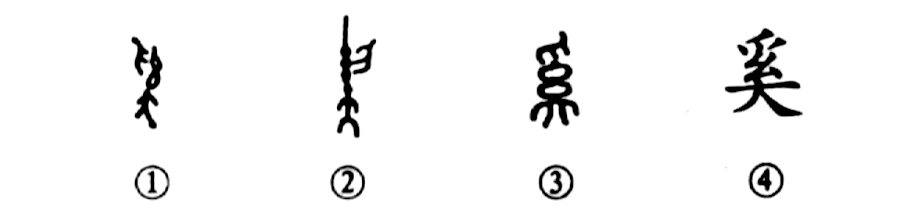 這個“奚”字是個會意字。甲骨文①的左上方是一只手(爪),手的右側是一條繩索形,繩索之下吊了一個人。這就表示捉來了一個奴隸。金文②的形體也基本上同于甲骨文,只是“手”移到了右上方。③是小篆的寫法,不太像捉住一個人的樣子了。④是楷書的寫法,原來的“人”形變成了“大”字。