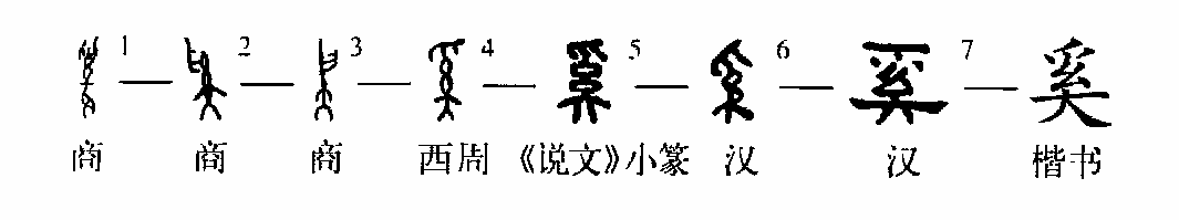 會意字。從爪,從幺(如從“糸”,繩索),從大(正立人形),表示用手拿繩索捆綁罪人。古代常以罪人充當奴隸。本義為罪奴。《周禮·天官·序官》:“酒人:奄(通‘閹’)十人,女酒三十人,奚三百人。”“奚”后因同音的關系借用為疑問代詞,相當于“何、哪里、哪個、什么、怎么樣”等。甲骨文上為向下的單手(爪)或雙手(雙爪),其下為繩索及被系頭頸的人形。金文字形仍前。甲骨文、金文例多用為專名。小篆更趨規整,隸楷文字由小篆演變而來。(郭小武葉青)