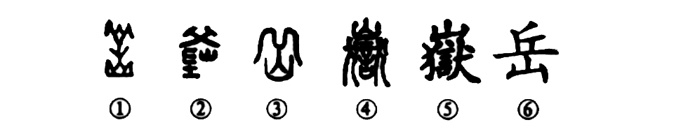“輕氣暖長岳,雄虹赫遠峰。”這個“岳”字的形體原很復雜。①是甲骨文的形體,像上下多層山岳的形狀,可見這是個象形字。②是古璽文的形體,由三部分組成,其上部像山峰起伏,其下左為“阜”,阜下為“土”,右為“山”,表示山岳之意。③是《說文》中古文的寫法,比古璽文簡化了許多,上為遠丘形,下有山。④是小篆的寫法,變成了“從山,從獄得聲”的形聲字了。⑤為楷書繁體字的寫法。⑥為簡化字。