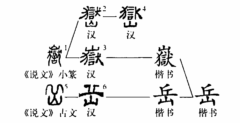 嶽和岳本來是一對異體字。嶽是形聲字,從山,獄聲。漢碑中,嶽字的山旁或居于上,或居于下,而右側的犬旁或變作