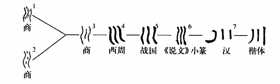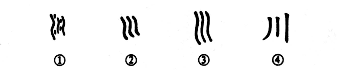 這是“百川灌河”的“川”字。甲骨文①?gòu)潖澢男螤钕褚粭l河流,曲線中的四個(gè)點(diǎn)兒是指河流中的漩渦。所以“川”字是個(gè)象形字,它的本義就當(dāng)河流講。金文②則把水中的“點(diǎn)兒”去掉了,這是為了書寫方便。③是小篆形體,同于金文。④是楷書的形體。