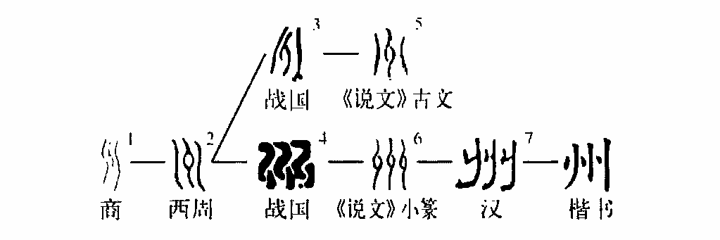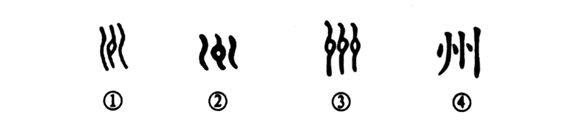 “關關雎鳩,在河之州。”這個“州”字是個象形字。你看甲骨文①的形體就很清楚,自上而下的三條曲線就是“川”字,表示河流,而中間有個小圓圈,表示水中有塊陸地。《說文解字》說:“水中可居曰‘州’。”所以“州”字的本義就是水中之陸地。金文②的形體基本上與甲骨文相同。小篆③則復雜化了,三支水流都加上了“小州”。而楷書④則把三個“小州”變成了三個“點兒”,這是為了書寫的方便。