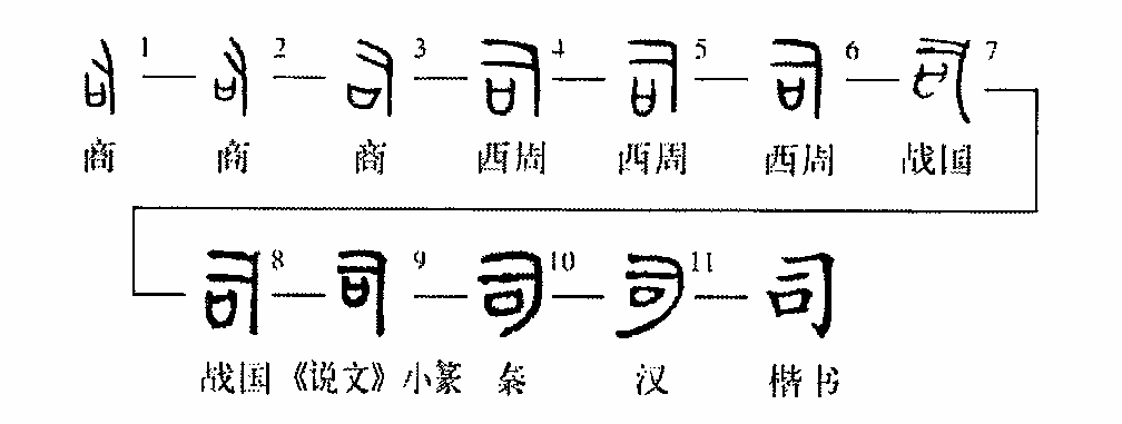 構(gòu)形之義不明。《說文》:“司,臣司事于外者。從反后。”甲骨文司字習見,作司,或作后,反正無別,皆為司字。用法相同,司字絕非“后”字之反寫。司字之構(gòu)形,均無令人信服的解釋,只能存疑。甲骨文司字不用為司管之義,而用為祀和祠。羅振玉《殷虛書契考釋》:“商稱年曰祀,亦曰祠。《爾雅·釋天》:‘商曰祀’。徵之卜辭,稱祀者四,稱司者三。曰‘惟王二祀’,曰‘惟王五祀’,曰‘其惟今九祀’,曰‘王廿祀’;曰‘王廿司’,是商稱年曰祀又曰司也。司即祠字。”西周金文司字多用作嗣,不用為主管之義的司,主管之義用??字表示,至戰(zhàn)國金文才用司字表示主管之義,一直到傳世文獻也如此,而??字只表示治理之義。??字從??,像以手治絲之形,因此有治理、主管之義,此為??字本義,??字從司,只是聲符。司字本義沒有主管、治理之義。司字本義不明,待考。(周寶宏)