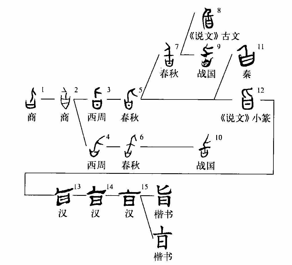 會意字。從匕,從口。匕,是進餐用的勺子,像用勺子向嘴里送食物。“旨”字在殷商已多見,當時偶見在“口”形內加橫畫的,西周有無橫畫者并見,春秋之后,“口”內增短橫而為“