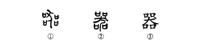 “玉不琢,不成器。”這個“器”字本為會意字。①是金文的形體,四邊有四個“口”,中間為“犬”。人喧嘩為“囂”,犬吠為“器”,所以“器”字應為“狺”(yín)字的初文。②是小篆的形體,與金文相似。③為楷書的寫法。