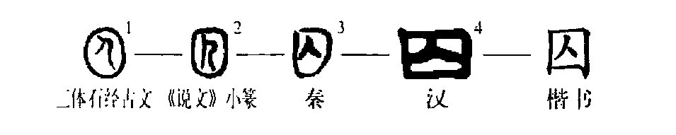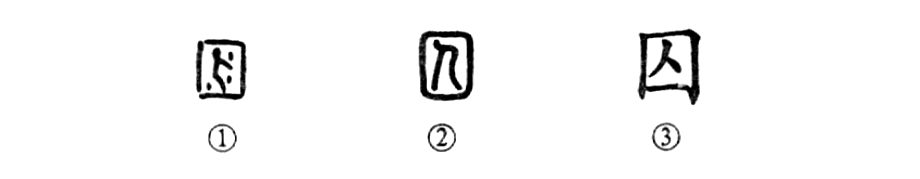 這個(gè)“囚”字很形象。從甲骨文①的形體看,周圍像個(gè)土坑或井形,中間是面朝右立著的一個(gè)人,人體周圍的點(diǎn)兒是表示難受得身上冒汗。這是把罪人或者俘虜關(guān)起來(lái)的意思。所以這就是“囚犯”的“囚”字,是個(gè)會(huì)意字。②是小篆的形體,方框中像一個(gè)面朝左而下彎腰的人,身上的汗點(diǎn)兒都去掉了??瑫?shū)③是由小篆形體變來(lái)的,其組成部分與小篆同。