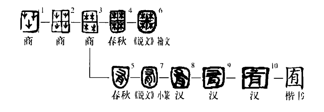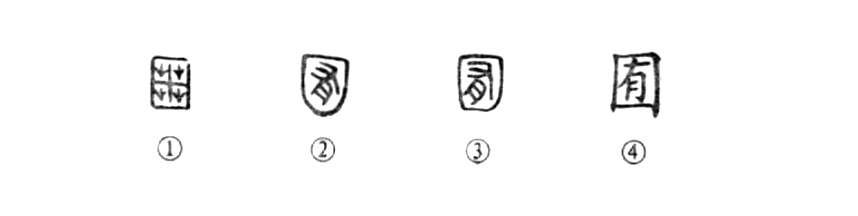 從這個字的甲骨文①的形體看,就像個周圍有園墻,中間有樹苗的苗圃。這就是個“囿”(yòu又)字。可見“囿”字的本義就是園林。后來專指古代帝王畜養禽獸的園林。這個字因為讀作“有”(去聲),所以到了金文②就變成于內聲(有)外形(囗)的形聲字“囿”了。小篆③的形體與金文一致,其內也是個“有”字。楷書④也是直接從小篆形體變來的。