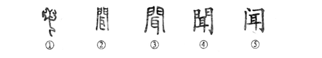 “春眠不覺曉,處處聞啼鳥。”這個“聞”字原為會意字。甲骨文①的下部是面朝右的人形,人的頭上有一只大耳朵,這就突出了“聽”的意思。②是戰國印文的形體,變成了外聲內形的形聲字,仍為“聽”意。③是小篆的寫法,與印文相似。④是楷書繁體字。⑤為簡化字。