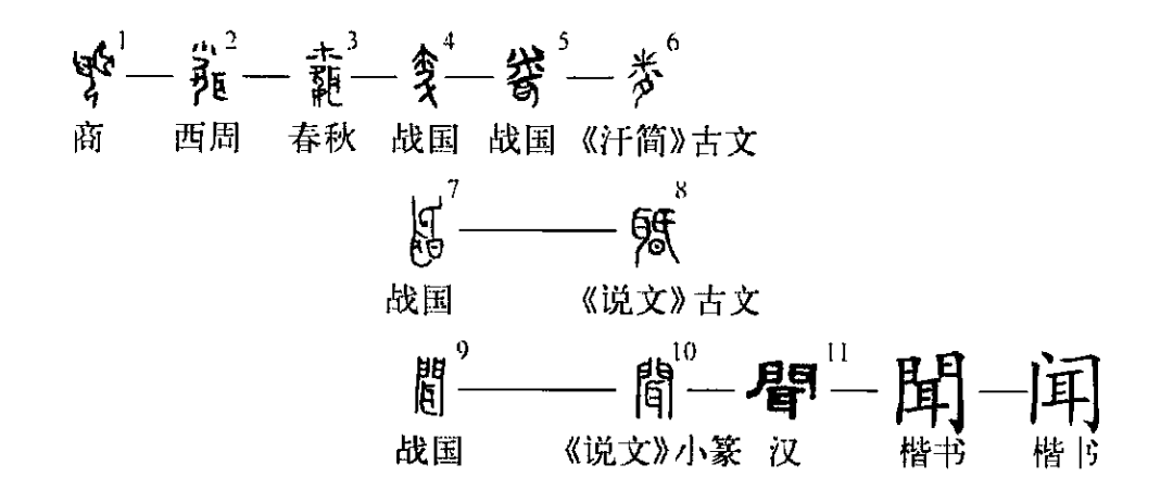 甲骨文聞為會意字,“象人跽而以手附耳諦聽之形”(李孝定語);西周金文形體發生訛變,為了追求字形的平衡,而將耳與身體割裂開來,置于其右,人形之上又增加裝飾性符號;春秋金文或加足趾形,與女旁相似;戰國文字有所省減,或省耳、或省人形,《汗簡》之古文應由戰國文字演變而來。戰國時期聞又另造形聲字,或從耳、昏聲,與《說文》古文相合;或從耳、門聲,沿用至今。本義是聽到,聽見。《合集》2421:“庚子卜,永貞,妣己聞? ”《孟子·梁惠王上》:“聞其聲,不忍食其肉。”引申為被聽到,即達到,傳布。《詩·小雅·鶴鳴》:“鶴鳴于九皋,聲聞于天。”又引申指使聽到,即報告。《合集》13651:“有疾齒,父乙唯有聞? ”又引申為聞名,著稱。由此引申為名譽,聲望。作名詞,又指聽到的東西,“見聞”主要指知識。又引申指傳聞,事跡。聞又指用鼻子嗅氣味。聽與聞是動作與結果的關系。《禮記·大學》:“心不在焉,視而不見,聽而不聞。”(秦曉華)