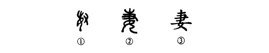 “爺娘妻子走相送,塵埃不見咸陽橋。”這個“妻”字是會意字。①是甲骨文“妻”字的形體,其下部為面朝左跪著的一個婦女,頭上是蓄長發之形,右上部有一只手,整個形體是“捉女為妻”,這與上古的搶親風俗有關。②是小篆的形體,與甲骨文基本相似。③是楷書的寫法。