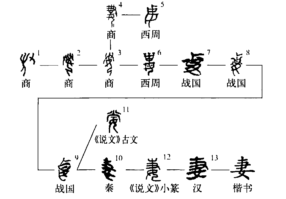 ”形隸變作“十”形。本義是男子的配偶。《說文》:“妻,婦與夫齊者也。”叔皮父簋:“其妻子用享孝于叔皮父。” 《詩·衛風·碩人》:“齊侯之子,衛侯之妻。”這種意義的“妻”讀為qī。用作動詞,指以女嫁人。《廣韻·霽韻》:“妻,以女妻人。” 《左傳·僖公二十三年》:“以叔隗妻趙衰,生盾。”這種意義的“妻”讀為qì。(徐在國)