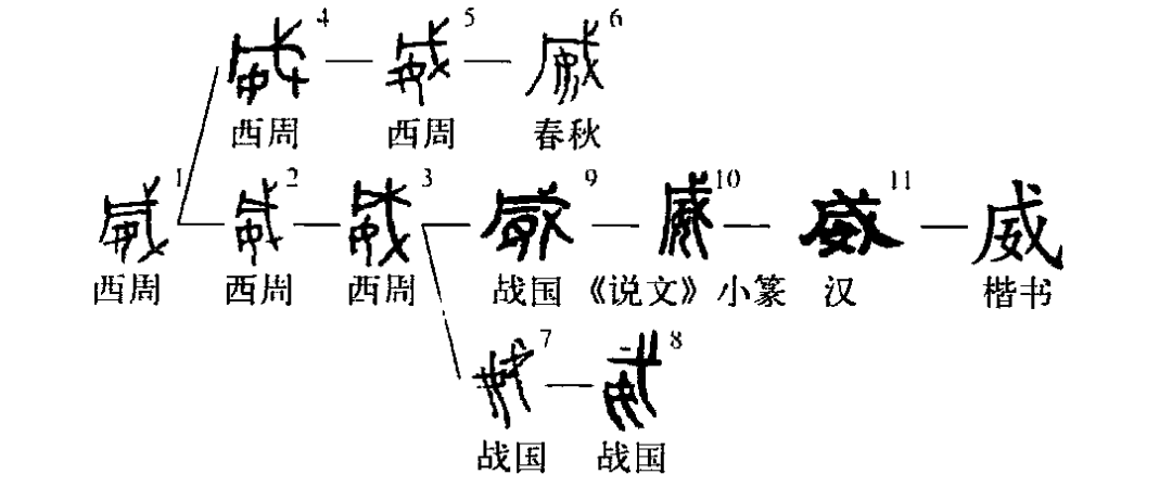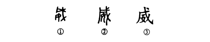 這是“威振天下”的“威”字。是個會意兼形聲的字。①是金文的形體,右邊是一把類似長柄大斧的武器,左下角是一個女人,即表示“施威”之意。“戊”也表聲。②是小篆的形體。③為楷書的寫法。