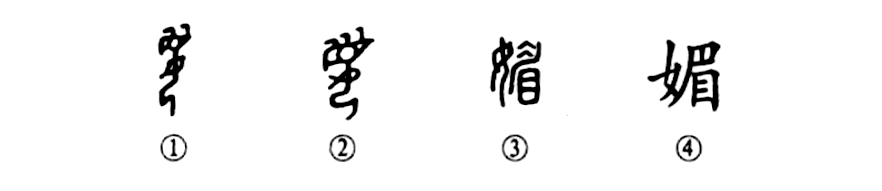 “回頭一笑百媚生,六宮粉黛無(wú)顏色?!边@就是“百媚生”的“媚”字。甲骨文①是面朝右跪著一個(gè)人(女),頭部是一只大眼睛,眼睛的上部是彎曲的兩根長(zhǎng)眉毛,表示好看。金文②的形體基本上同于甲骨文。③是小篆的形體,變成了左形(女)右聲(眉)的形聲字了。④是楷書的寫法,與小篆的形體結(jié)構(gòu)完全一致。
