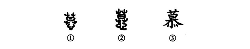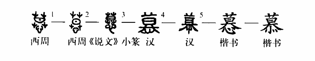“慕風而就山,慕水而就川。”這個“慕”字是個形聲字;金文①的上部是個“莫”字,日落草中,表示太陽下山了;其實“莫”就是“暮”字的初文,不過它在“慕”字中只表讀音,而下部的“心”字才是表意的。這樣,“慕”字就成了上聲(莫)下形(心)的形聲字了。②是小篆的形體,與金文的結構完全一致。③是楷書的寫法。“心”字如在一個字的下部,有時寫作“”,除了“慕”字以外還有“恭”字。從筆畫的數目上看,“心”與“”均為四筆,只是筆形上有些差異。