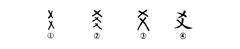 象形字。商代甲骨文凡四筆,每兩筆作一交織叉狀,然后兩叉上下重疊,象交叉、交錯、交會之形。繁體則為六筆,作三叉重疊,然未取得主流地位。戰國時或將重疊的兩叉整合作井形的