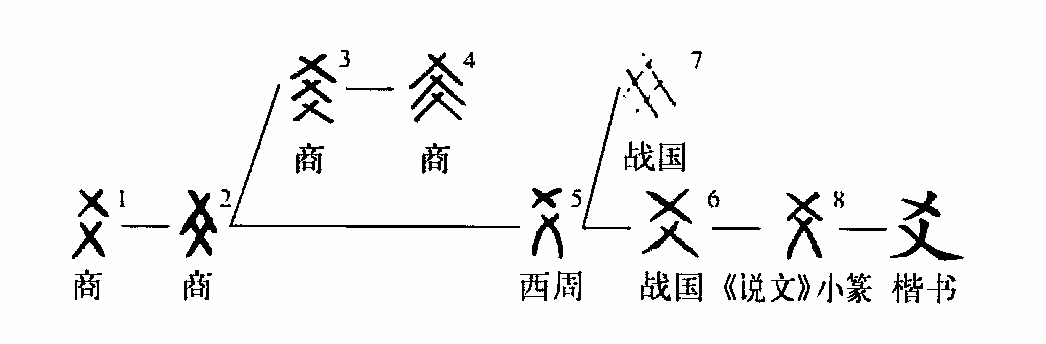 ,亦未進入主流??瑫髫场!墩f文》本義為交,即交織、交錯?!兑住肥褂玫呢苑儞Q交錯,故以爻命其基本符號。?為陽爻,?為陰爻,三爻相重得八卦,六爻相重得六十四卦。《易·系辭上》:“六爻之動,三極之道也。”卜辭用作人名。《殷虛書契后編》4.11:“貞:?(侑祭)于爻戊(即學戊,人名)? ”亦用作地名。《前編》 1.44.7:“王狩于爻?”用作族名。父乙簋:“爻父乙。”通“崤”,地名。韓方足布“土爻”讀土崤。通“殽”,地名。秦陶“爻”讀殽。以上讀yáo。通“效”,效法。《易·系辭上》 “爻法之謂坤”古本作“效”。通“