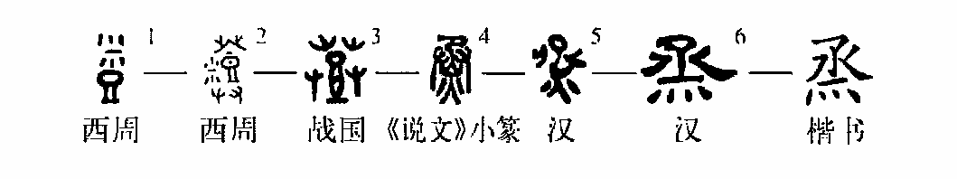 《周禮》:“以烝,冬享先王。”這個“烝”字本為會意字。甲骨文①的上部為“禾”,屮間為禾米盛于“豆(食器)”中,下部是一雙手表示祭祀。②是金文的形體,省去了“禾”與雙手,只是豆中有米。③是小篆的形體,上部變為“丞”,下部增加了“火”。④為楷書的寫法。
