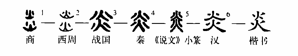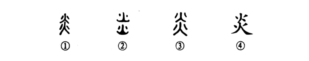 “炎”字是個會意字。甲骨文①的上下兩把大火,火光沖天,表示火旺。②是金文形體,同樣是兩把大火。③是小篆形體,同甲骨文的形體更為接近。④是楷書形體,由小篆直接演變而來。