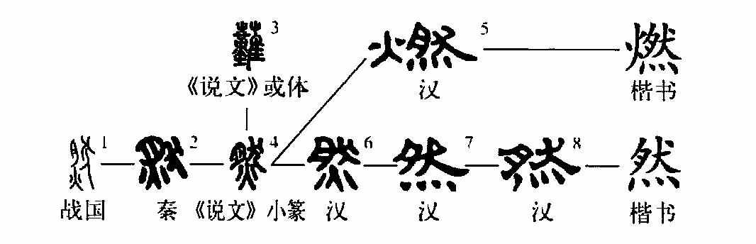 ,為從火、難聲或?聲的形聲字。“然”字本義是燃燒。《說文》:“然,燒也。”徐鉉注:“然,今俗別作燃。”《孟子·公孫丑上》:“凡有四端(仁、義、禮、智四種開端)于我者,知皆擴(kuò)而充之矣,若火之始然,泉之始達(dá)。”“然”字因借用作代詞、嘆詞、副詞、連詞、助詞等,本義反被掩蓋了,為便于區(qū)別,人們又在“然”下增加形符“火”,造了個從火、從然、然亦聲的會意兼形聲字“燃”。從此,“燃”專職指燃燒,“然”則用于各種假借義。戰(zhàn)國文字左上為“肉”的古字形,左下為“火”,右為頭朝左的直立犬形;小篆結(jié)構(gòu)略有變化,上左為肉形、右為“犬”,下為“火”。就構(gòu)形取意而言,有一種直觀通俗的理解,認(rèn)為以“火”燒“犬”之“肉”即為“然”(燃)。后來為了形體結(jié)構(gòu)平整,位于下部的火形演變成“灬”。(郭小武 葉青)