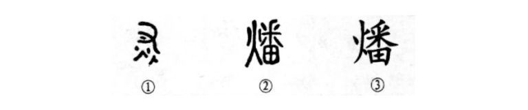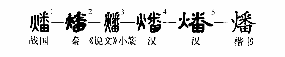 “燎毛燔肉不暇割,飲啖直欲追羲媧。”這個“燔”字讀作fán,本為會意兼形聲的字。①是金文的形體,上為省略的“掌(獸掌)”形,下部為“火",表示火烤獸掌。②是小篆的寫法,將上部的掌變為“番(本為獸掌形)”,“火”移于左邊,其義不變。③是楷書的寫法。