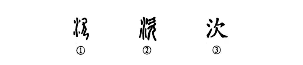 這就是“垂涎三尺”之“涎”字的異體字“?”。這個字很有意思,甲骨文①的右邊是面朝左跪著的一個人,張開大嘴巴,其左是從口中流出了長長的口水——饞人想吃美味,但又吃不上,于是“垂涎三尺”。可見這是個會意字。②是小篆的形體,是由甲骨文直接演變而來的。③是楷書形體。