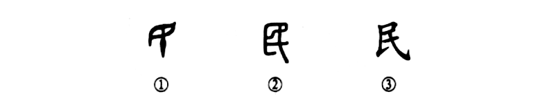 這個“民”字是個象形字。金文①的上部是一個眼睛,其下是一把錐子刺進(jìn)了眼睛。這表明在奴隸制社會里,奴隸主用極其殘酷的手段把奴隸的一只眼睛刺瞎,并強迫他們勞動。小篆②形體大變,完全看不出錐子刺眼的形象了。③是楷書的寫法,是由小篆直接演變而來。