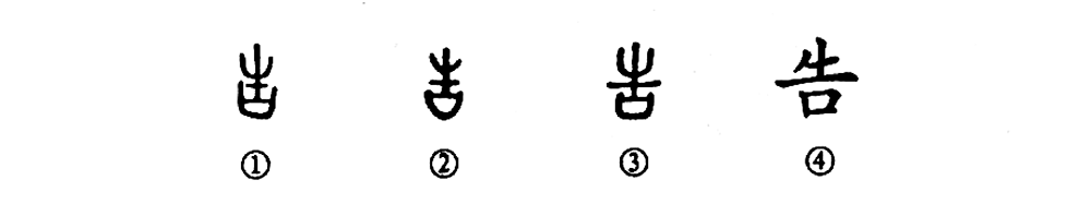 “一葉知秋,寸綠告春。”這個“告”字是個會意字。甲骨文①的上部是個“牛”(牛頭形),下部是個“口”字,大意是,用口告訴人,“這個牛是要牴人的!”正如《說文解字?口部》所說的:“牛觸人……所以告人也。”②是金文的形體,③是小篆形體,均與甲骨文相似。④是楷書的寫法,把“牛”字的下半截去掉了,寫作“告”。
