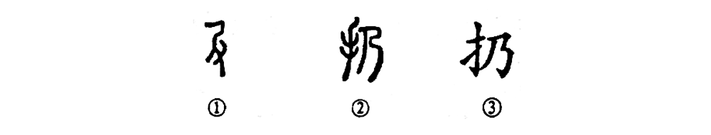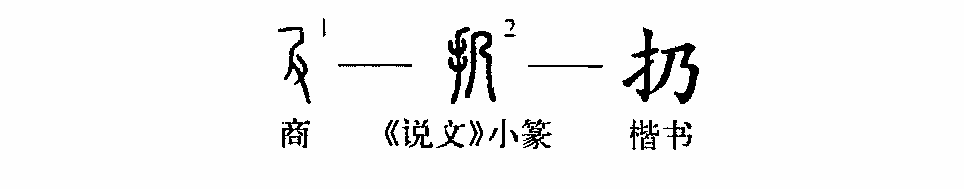 這是“扔掉”的“扔”宇,本為會意字。甲骨文①的右下方是一只右手,左方是一個曲形之物(乃),表示手扔之意。②是小篆的形體,手移到“乃”的左邊。③是楷書的寫法。