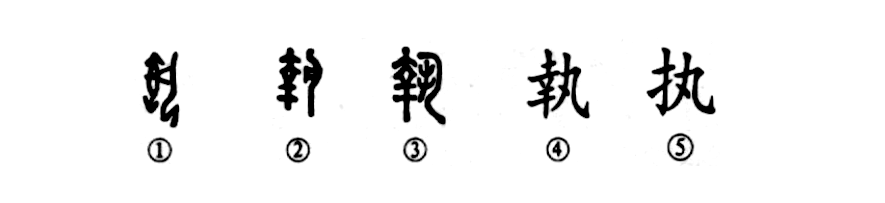 “官不過侍郎,位不過執戟?!边@個“執”字本為會意字。①是甲骨文的形體,左邊是類似手銬一類的刑具,右邊是一個面朝左半跪著的人,雙手被手銬鎖住。②是金文的形體,與甲骨文相似。③是小篆的寫法,左邊的刑具和右邊的人都失去了原形。④為楷書的繁體字。⑤為簡化字。