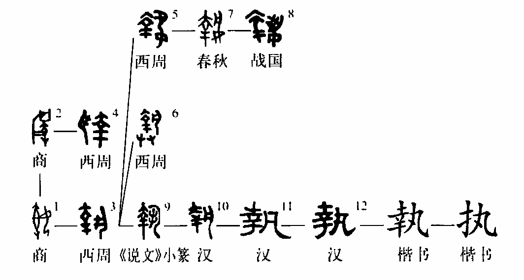 會意字。從丮(jǐ),像伸出雙手之人形;從?(幸,niè),像手銬之形;全字表示給伸出雙手之人戴上刑具。本義為拘捕。《說文》:“執,捕罪人也。”《詩·大雅·常武》:“鋪敦淮??(布陣靠近淮水邊),仍執丑虜。”由拘捕義引申為持、拿,又引申為掌握、掌管、主持、控制、施行、堅持、固執等義。“執”又由“持、拿”引申為持、拿的東西,即憑單,如“回執”、“收執”。甲骨文像人(或朝左,或朝右)雙手戴刑具之形,或連頭頸一起使用刑具束縛。文例有“執羌” (逮住了羌族的人)、“執寇”(逮住了強盜)、“執兕”(逮住了犀牛)等。金文字形漸趨訛斷或有加繁。文例中很多是“折首執訊”,指在戰斗中斬掉敵人的首級,逮住敵人作俘虜。小篆成左“?”、右“丮”;隸楷文字由小篆演變而來,寫作“執”?,F代漢字簡化時,“執”據草書簡作“執”。(郭小武葉青)