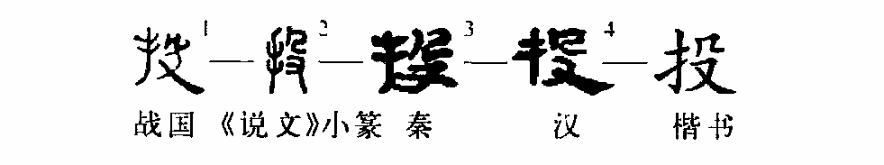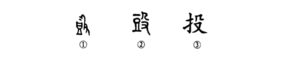 這是“投筆從戎”的“投”字,是個(gè)會(huì)意字。甲骨文①的左邊是“豆”,右邊是“殳”,表示“敲擊”義。②是小篆的形體,由甲骨文直接演變而來。③是楷書的寫法,將“豆”換成提手旁。