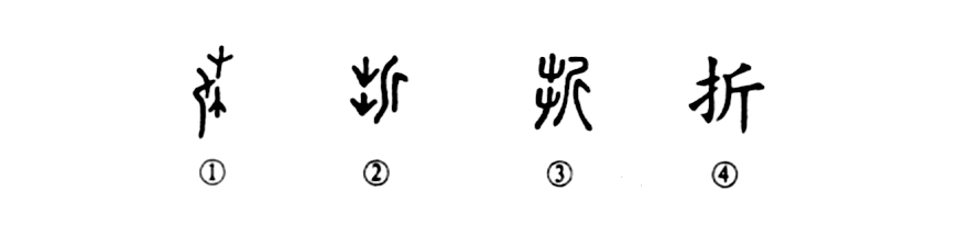 “春風喚新葉,酷霜百卉折。”這個“折”字是個會意字。甲骨文①就很形象,其左是一把曲柄橫刃大斧(斤),右邊是一棵小樹(木);木匠掄起大斧猛力一砍,把小樹攔腰砍斷(上部是樹頭,下部是樹根)。金文②則把斧頭移到了右邊,其左下部的樹根又顛倒了一下(樹根朝上),這就是金文所發生的偽變。到了小篆③又發生了第二次偽變,其左邊變成上下兩棵草,變成用斧頭砍草的意思了。等到楷書④又發生了第三次偽變,其左變成了一只手(提手旁),好像是說以手拿大斧之義。