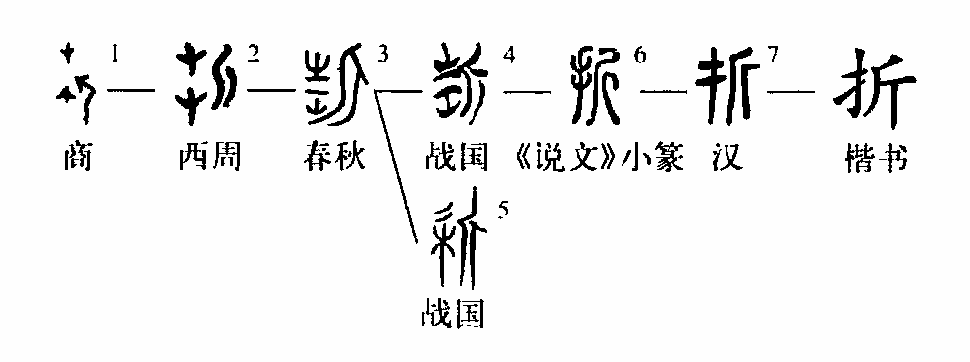 ”,從斤,從斷木,會以斧斤斷木之意。“折”字之本義即是指折斷、弄斷。《說文》:“折,斷也。” 《易·豐》:“折其右肱。” 《荀子·勸學》:“鍥而不舍,朽木不折。”引申之亦可指斬。《逸周書·克殷》:“斬之以黃鉞,折懸諸太白。”孔晁注:“折,絕首也。”虢季子白盤:“折首五百。” “折”字西周金文作“