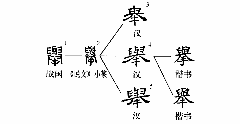 壺:“舉賢使能。”小篆從手,本作擧。清邵瑛《說文群經(jīng)正字》:“今經(jīng)典作舉。隸變漢碑多如此作,今俗因之。”可見,隸變以后,舉的下部由“手”變?yōu)?ldquo;