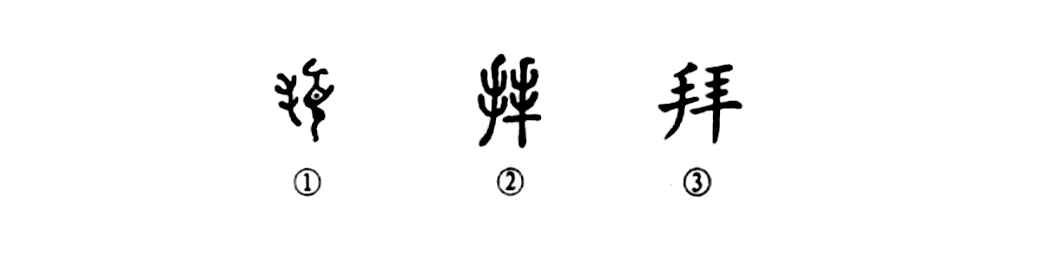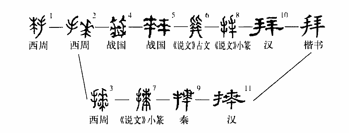 ,揚雄說,拜從兩手下。”所釋為“拜”之常用義。段玉裁《說文解字注》:“首至手也,各本作首至地也,今正。首至地謂稽首,拜中之一,不可該九拜。‘拜’之名生于‘空首’。故許言首至手。《周禮》之‘空首’,他經謂之拜手。鄭注曰:‘空首,拜頭至手,所謂拜手也。’ ……詳言曰拜手,省言曰拜。拜本專為空首之稱,引申之則稽首、頓首、肅拜皆曰拜。”指雙手作揖,是表示敬意的一種禮節。《書·益稷》:“皋陶拜手稽首。” 《荀子·大略》:“平衡曰拜,下衡曰稽首。”拜是拱手彎腰,頭俯至手而不至地,如今之“揖”,稽首則是頭要觸到地面的一種禮節,二者有所不同。后來作為行禮的通稱,不僅指拱手彎腰而已,屈膝頓首、兩手著地或叩頭及地等均為拜。《周禮·春官·大祝》:“辨九拜,一曰稽首,二曰頓首,三曰空首,四曰振動,五曰吉拜,六曰兇拜,七曰奇拜,八曰褒拜,九曰肅拜,以享右祭祀。”由表示敬意的禮節,虛化為敬辭,表示恭敬。宋曾鞏《北歸三首》其二:“拜捧恩書喜滿顏,馬蹄遙望斗杓還。”(荊亞玲 蔣曉薇)——李學勤《字源》