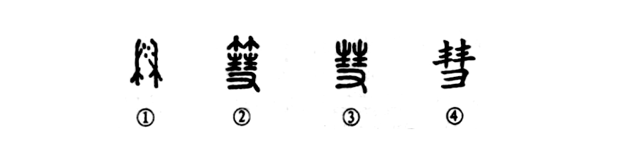 “昭王擁彗先驅。”這個“彗”字本為會意字。①是甲骨文的形體,像兩把掃帚,上部中間的三個點兒指灰塵??傮w表示以帚掃除塵灰。商承祚認為:“下掃謂之掃,上掃謂之彗。”②是小篆異體字,其上增加“竹”,表示掃帚是用竹做成,中間是掃帚的訛變之形,下邊為一只手(又)。③是小篆的形體,上部無“竹”。④為楷書寫法。