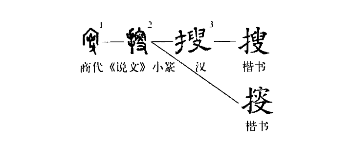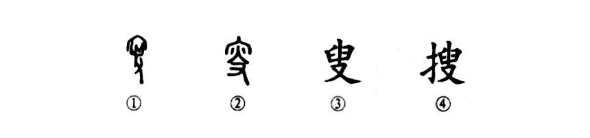這個“搜”字本為會意字。你看甲骨文①的上部是“宀”,表示古代的房屋,屋內有一個火把,右下角是一只手,也就是說,手拿火把在屋內搜索。②是小篆的形體,仍然是由“宀”、“火”、“手”三部分組成??墒堑搅丝瑫塾謧巫優?ldquo;叟”,完全不像原來的形體了。后來因為“叟”字被假借為當“老人”講,那么要表“搜索”之義,就只好在“叟”之左又增加了個提手旁(扌),變成了左形右聲的形聲字“搜”了。