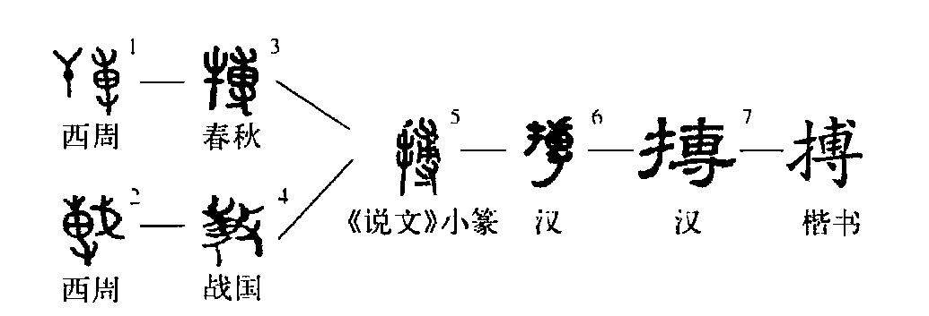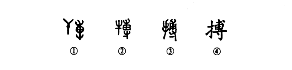 “搏手困窮,無望來秋。”這個“搏”字本為形聲字。①是金文的形體,左邊是“干(盾之類的武器)”,表示用武器搏斗,右邊的“尃”表示讀音。②是石鼓文的形體,左邊的“干”訛變為“牛”。③是小篆的形體,由“牛”變為“手”,有道理。④為楷書的寫法。
