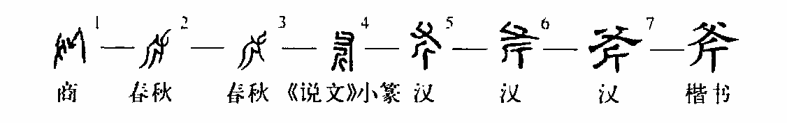 形聲字。《說文》:“斧,斫也。從斤,父聲。”斫指砍伐的意思。斧是用來砍伐樹木的工具,也用作砍伐人的刑具,用處很廣。斧字在商周墓葬中多有出土,與今天之斧基本相同。在甲骨文,斧字就已經(jīng)變?yōu)樾温曌?,但?ldquo;斧”字所從的“父”聲旁本是石斧的象形字,本作