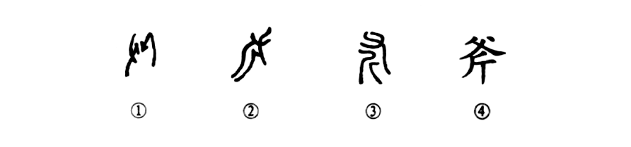 “林木茂而斧斤至焉。”這個“斧”字本為形聲字。①是甲骨文的形體。右邊是“斤(斧頭)”,表形;左為“父”,表聲。②是金文的形體。③是小篆的形體,變?yōu)樯下曄滦蔚男温曌?。④為楷書的寫法?/span>