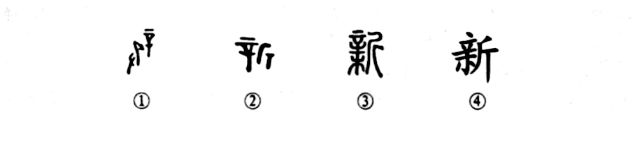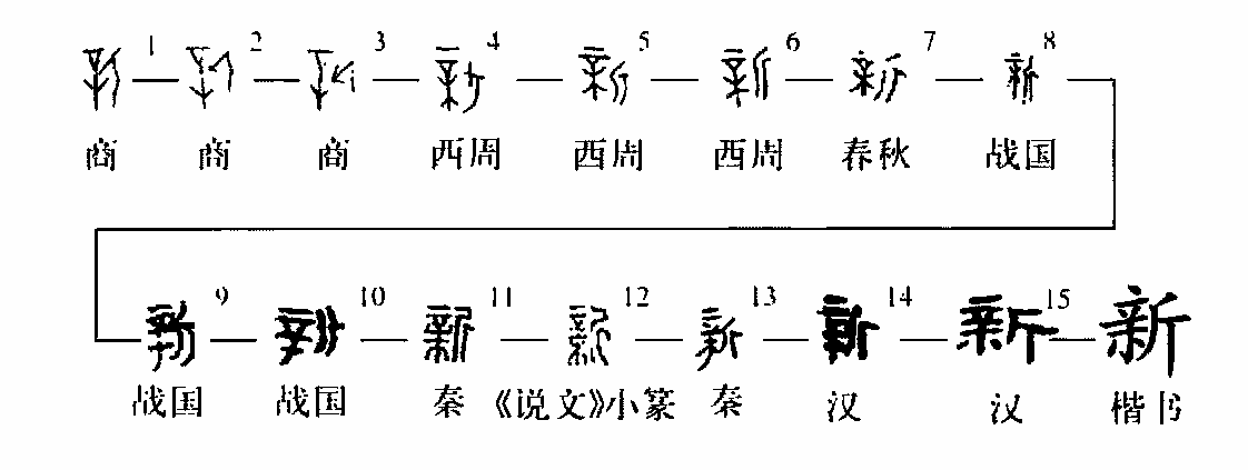 形聲字。《說文》:“新,取木也。從斤,??聲。”段玉裁注:“取木者,新之本義,引申之為凡始基之稱,《采芑》傳:田一歲曰菑,二歲曰新田。”徐灝段注箋:“斫木見白新也。凡物之易于更新者莫如木,故取義焉,因之伐木謂之新,后又加艸為薪。”王筠釋例:“然則新為采取,薪為芻蕘,雖分動靜,實一字也。為新舊字所專(舊字亦本鵂留為本字),人遂不覺耳。”“新從??聲,其訓曰取木,則新乃薪之古文。《詩》:‘薪之槱之’,固以靜字作動字用也。”甲骨文中新字已有從辛從斤或從辛從木從斤兩體,西周金文,春秋戰國文字,甚至到了秦漢文字中仍然是這兩種形體并行。甲骨文