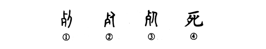 古人對死去的老者或戰死者是很重視憑吊的。甲骨文①的左邊是殘骨的形 狀,右邊是躬身下拜的一個人。這本來就是憑吊死者之意,后即代表“死”。金 文②的左邊仍為殘骨,而右邊的人站立起來了。小篆③大體上像金文的形體。 楷書④上左的“歹”字就是“不好”的意思,右邊的“匕”是倒人之形,所謂 “歹人”就是“死人”。