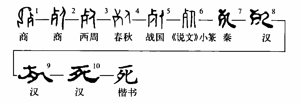 會意字。甲骨文從人(或從人之跪跽形)從歺(尸骨)會意。“死”本義為生命終止。《甲骨文字詁林》:“羅振玉說,象生人拜于朽骨之旁,死之義也。”后“人”旁訛為“匕”而成“死”字。《列子·天瑞》:“死者,人之終也。”《說文》:“死,澌也,人所離也。”段玉裁注:“《方言》:‘澌,索也,盡也。’是澌為凡盡之稱,人盡曰死。”死之本義甲骨文已見, 《合集》17059:“
