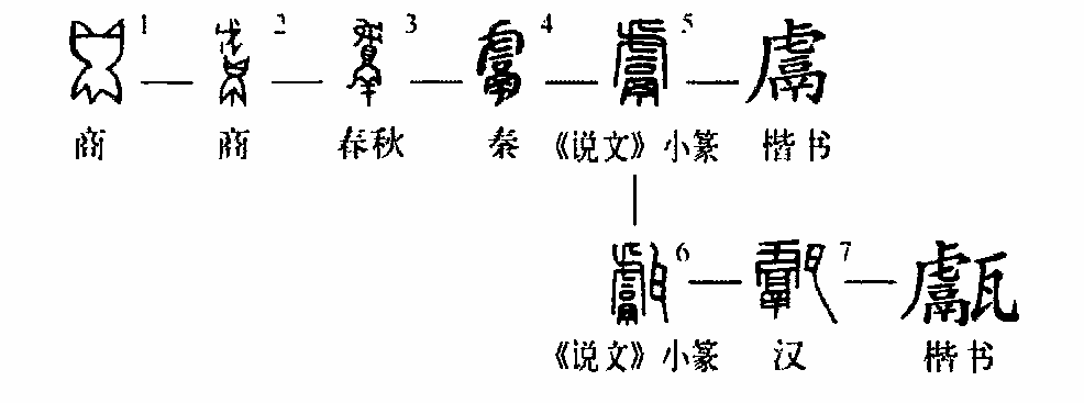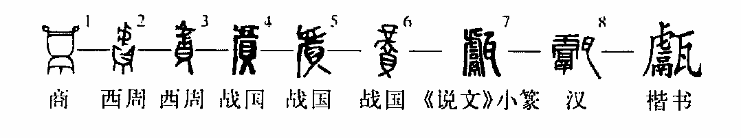 形聲字。甲骨文中“鬳”字初文是象形字,下鬲上甑,或分或連,甑的下部隔以有孔的板,上部放食物,下部的鬲中放水,用來蒸、煮食物。其字形與“鼎”和“鬲”相近,上增聲符“?”。因增加了新的區別特征,象形的“鬳”有的簡化為“鬲”,變成了從鬲、?聲的形聲字;有的訛變為從鼎、?聲,后來鼎又訛為“貝”。秦漢時期在“鬳”上又增加了形符“瓦”。《說文》訓“鬳”為“鬲屬”,卷十二又說:“甗,甑也。一曰穿也。從瓦,鬳聲。”“鬳”與“甗”形、音、義都有密切聯系,顯然是古今異體字。“瓦”部字大都始于秦漢,后“甗”行而“鬳”廢。(李守奎)
