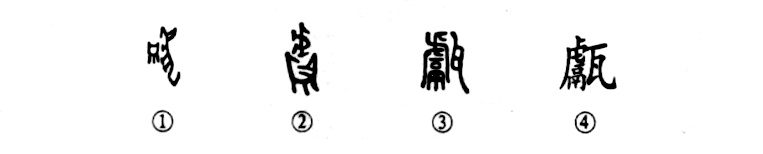 這個“甗”字讀作yǎn,本為會意字。①是甲骨文的形體,左邊是一只大鼎,右邊是一只虎,表示以鼎烹虎。②是金文的形體,將虎頭放在鼎中,更有烹煮之意。③是小篆的形體,虎頭之下為“鬲”,右邊又增一“瓦”字,變成了會意兼形聲(右形左聲)的字,復雜化了。④為楷書的形體。