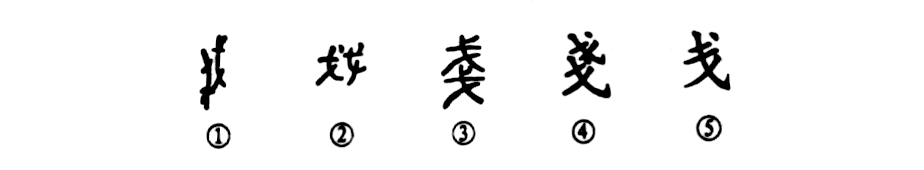 這是“戔戔微物”的“戔”字,讀作cán,本為會(huì)意字。甲骨文①像兩戈相向,當(dāng)為“殘”的初文。②是戰(zhàn)國(guó)楚簡(jiǎn)文字,兩戈并列。③是小篆的的形體,兩戈上下結(jié)構(gòu)。④為楷書繁體字。⑤為簡(jiǎn)化字。