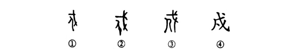 這是“從軍昔戍南山邊”的“戍”字,是個會意字。甲骨文①的左下部是個“人”,面部朝左而側立。右上方是“戈”(武器),“人”在“戈”旁,就是“守衛”的意思。②是金文的形體,與甲骨文極為相似。③是小篆的寫法,也是從甲骨文演變過來的。④是楷書的形體,戈的左下方是人。