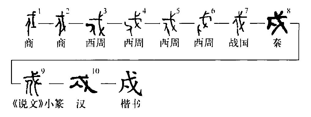 會意字。甲骨文“戍”字從人在戈下,會戍守之意。金文承襲甲骨文,所從的“人”旁豎筆上或加點為飾。秦簡“戍”字所從的“人”旁上部或與“戈”所從的橫畫相交,遂為隸楷所本。本義是防守邊疆。《說文》:“戍,守邊也。”錄卣:“女(汝)其以成周師氏戍于□??。”《詩·王風·揚之水》:“不與我戍申。”毛傳:“戍,守也。”引申指戍守部隊。甲骨文多用此義。《京都大學人文科學研究所藏甲骨文字》2142:“其乎戍御羌方。”(命令戍守部隊抵御羌方)(徐在國)